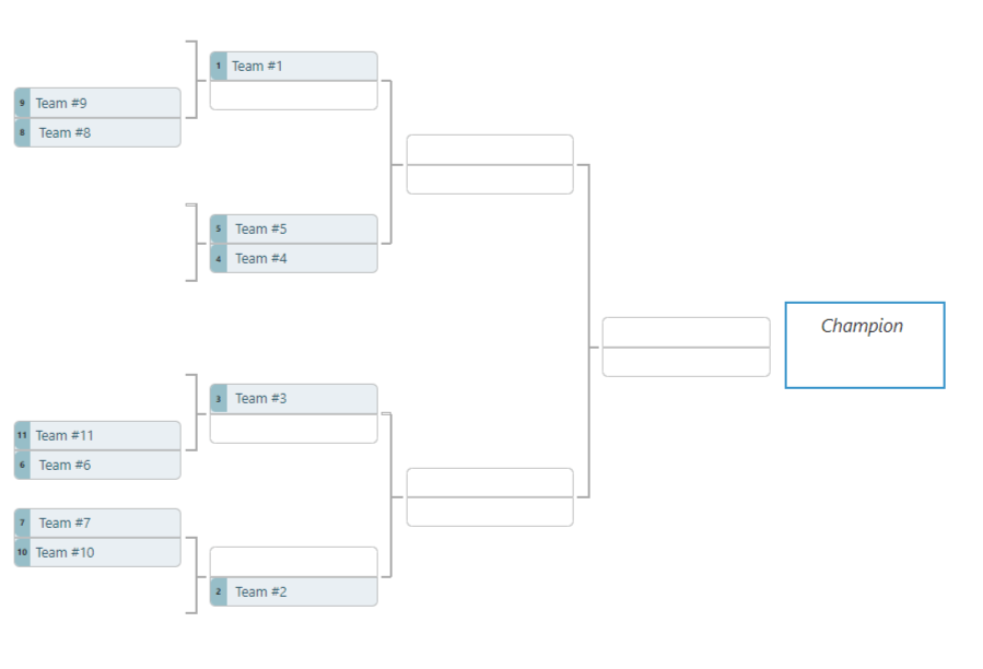 Typically a tournament bracket with an odd number of teams is constructed by seeding teams, then giving teams with the highest seed a first round bye. The goal is to get the tournament down to the nearest power of 2 (e.g. 2, 4, 8, 16, 32, etc). Any remainder after this is the number of bye teams needed. For example, to create an 11-team tournament, the 11-team tournament's nearest power of 2 value is 8, hence 3 teams would need a first round bye. So in the figure below, the 3 highest seeded teams do not play in the first round. 11-Team tournament bracket example
